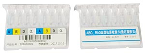 血型檢測卡用于快速檢測新鮮血液的ABO血型。在每一個檢測孔內滴加一至二滴待測紅細胞懸液(濃度不低于2%),混合作用30秒鐘后,上下傾斜試劑卡或用牙簽攪勻,不要讓液體流出孔外,1分鐘內觀察結果。有砂粒狀凝結物的為陽性,沒有凝結物的為陰性。